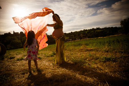 Un campo di grano, la luce del tramonto, o meglio in gergo tecnico "l'ora d'oro", un vestito unico e una mamma danzatrice del ventre, tutti ingredienti per una sessione fantastica.